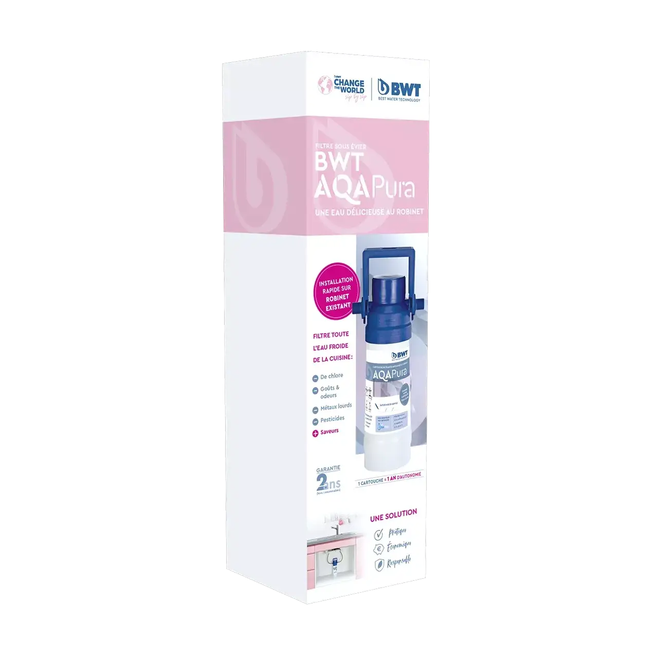 Le filtre sous évier BWT AQA Pura élimine efficacement les particules responsables du mauvais goût et odeur. Il est composé d’une tête de filtre et d’une cartouche de charbon actif.